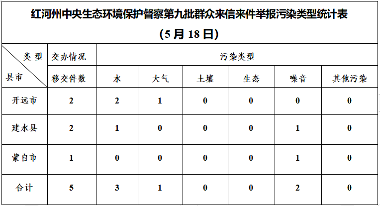 5月18日,红河州收到中央第七生态环境保护督察组交办的第九批群众信访举报件5件(其中来电举报2件,来信举报3件),涉及开远2件、建水2件、蒙自1件;从信访举报件生态环境问题类型来看,涉及水3件、噪音2件、大气1件(部分举报件涉及多个问题类型)。