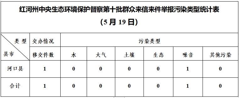 5月19日,红河州收到中央第七生态环境保护督察组交办的第十批群众信访举报件1件(来信举报),涉及河口县;从信访举报件生态环境问题类型来看,涉及噪音。