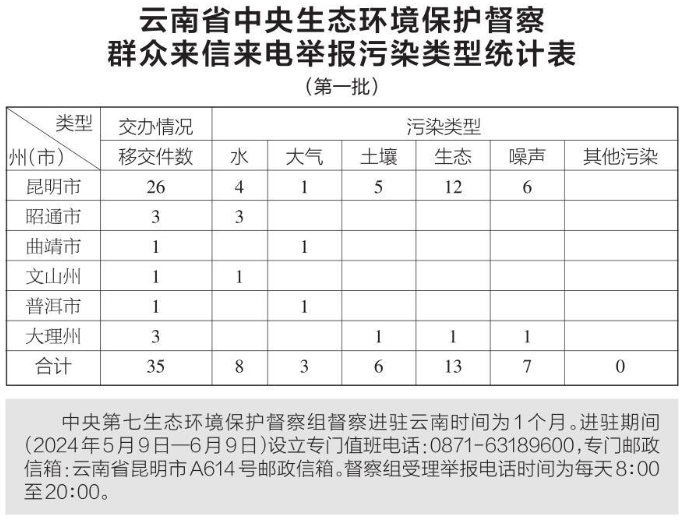 5月10日,中央第七生态环境保护督察组向云南移交第一批群众信访举报件35件,其中来电举报35件,来信举报0件。从信访举报件生态环境问题类型来看,涉及水8件、大气3件、噪声7件、土壤6件、生态13件(部分举报事件涉及多个问题类型)。从区域分布上看,昆明市26件、昭通市3件、曲靖市1件、文山壮族苗族自治州1件、普洱市1件、大理白族自治州3件。所有举报件均已及时转交相关州(市)处理。
